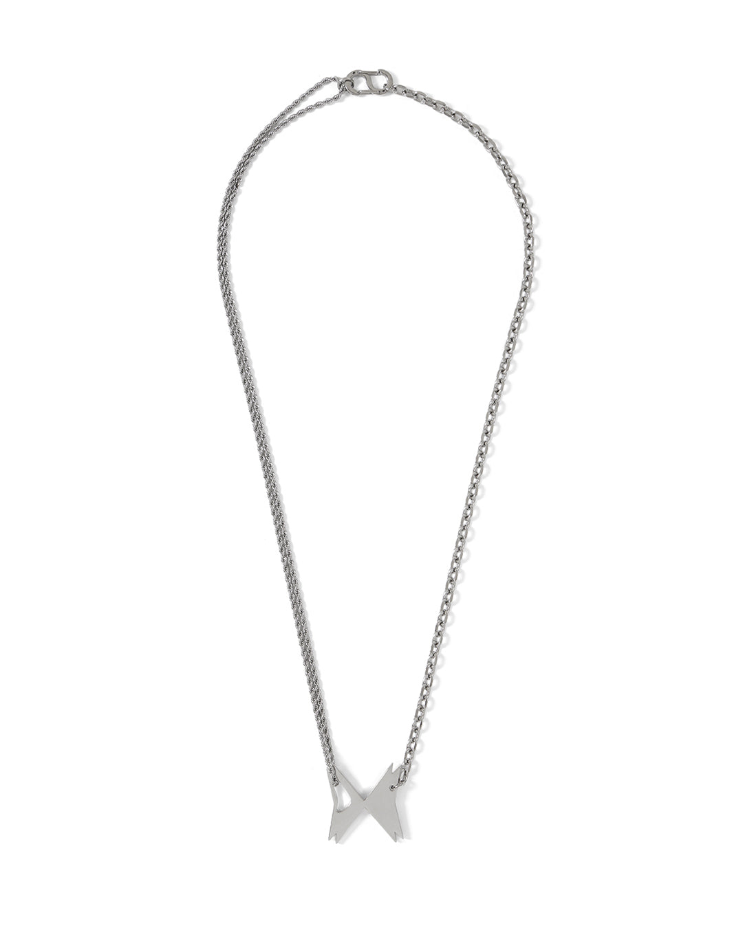 A custom necklace featuring the METAMORFOSI logo in raw metal. Different chain details collide to express individuality within the collective.
